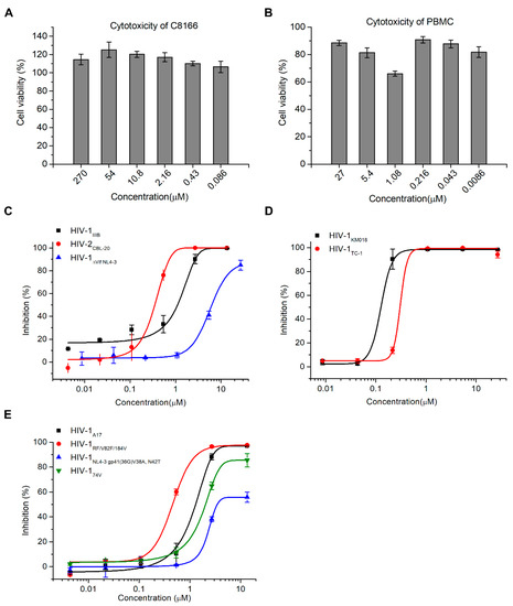 The cytotoxicity of the compounds on C8166 and PBMCs were determined by the MTT colorimetric assay as described previously [57]. C8166 cells (4 × 104 cells/well) or PBMCs (5 × 105 cells/well) were co-incubated with serially diluted compounds in 96-well plates at 37 °C with 5% CO2. After incubating for 3 days (PBMCs for 7 days), cell viability was determined by using the MTT assay, and the concentration required for 50% cytotoxicity (CC50) was determined.