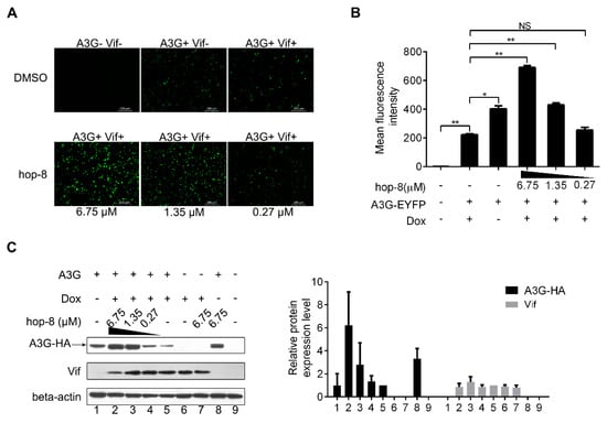 Hop-8 restored A3G levels in cells undergoing Vif-mediated A3G degradation. (A) Fluorescence photographs were taken with a fluorescent microscope (Leica DMI4000B); (B) Cells were harvested, and EYFP expression in live cells was analyzed with a FACSVerse flow cytometer. Data are expressed as the means ± SD of at least three independent measurements. Statistical comparisons were performed between A3G-EYFP, the Vif positive group (column 2) and other groups with the pair-sample t-test with Origin 8.5. (p < 0.05, significant difference; *: p < 0.05; **: p < 0.01; NS: not significant); (C) pcDNA3.1-APOBEC3G-HA (0.5 μg) was transfected into TRex-hvif-15 cells. The compound (6.75, 1.35, and 0.27 μM) containing 0.1 μg/mL Dox was added 6 h post-transfection. The relative expression levels of A3G-HA and Vif were normalized by the levels of beta-actin. Values are presented as normalized intensities relative to the values of the Dox and A3G-HA positive groups (lane 5). Each data point represents the mean relative quantity ± standard deviation (bars), n ≥ 3.