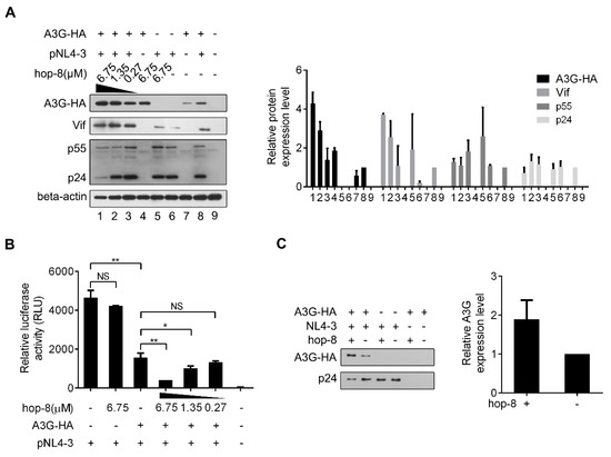 Hop-8 enhanced the expression of A3G and reduced p24 expression in HIV-1 producing cells and reduced the infectivity of the produced virus. (A) Hop-8 increased the expression of A3G and Vif while reduced the p24 expression in HIV-1 producing cells. The plasmids pcDNA3.1-APOBEC3G-HA (0.125 μg) and pNL4-3 (0.375 μg) were transfected into 2 × 105 293T cells. The compound was diluted to 6.75, 1.35, and 0.27 μM with DMEM and added to the wells 6 h post-transfection. The relative expression levels of A3G-HA, Vif, p55, and p24 were normalized by the levels of beta-actin. Values are presented as normalized intensities relative to the values of the pNL4-3 and A3G-HA positive groups (lane 8). Each data point represents the mean relative quantity ± standard deviation (bars), n ≥ 3. (B) Hop-8 reduced the infectivity of the progeny virus. The supernatant of NL4-3 was collected and 4 × 104 TZM-bl cells were infected with NL4-3 that contained 20 ng p24. The residual infection was determined using relative luciferase activity. All data represent the means ± standard deviation (bars), n ≥ 3. Data were analyzed by the unpair-sample t-test with Origin 8.5. (p < 0.05, significant difference; *: p < 0.05; **: p < 0.01; NS: not significant). (C) Hop-8 increased the incorporation of A3G in progeny virions. pcDNA-APOBEC3G-HA (1 μg) and pNL4-3 (1 μg) were transfected consecutively or co-transfected into 293T cells in 6-well cell culture plates. Cells were cultured with or without hop-8 (2.7 μM) for 48 h. The supernatant was collected and centrifuged at 2000× g and the cell debris was discarded. The viral particles were lysed with 0.5% Triton-X100. A3G and p24 levels in the supernatant were determined by western blot. The relative expression levels of A3G-HA were normalized by the levels of p24. Each data point represents the mean relative quantity ± standard deviation (bars), n ≥ 3.
