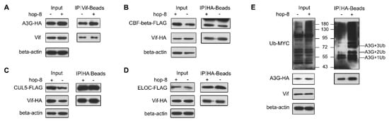 The interactions between Vif and A3G, CUL5, ELOC, or CBF-β were determined by co-IP assays. The results showed that both in the absence and presence of hop-8, Vif exhibited strong binding with A3G. Hop-8 did not disrupt the interaction between Vif and A3G (Figure 6A). Meanwhile, the co-IP assays between Vif and CUL5, ELOC, or CBF-β demonstrated that hop-8 did not interfere with the interaction of Vif with CUL5, ELOC, or CBF-β (Figure 6B–D). Next, the polyubiquitination of A3G was examined. The results showed that hop-8 did not block A3G ubiquitination (Figure 6E). These results suggest that hop-8 did not inhibit Vif from binding with A3G or CBF-β and recruiting the cellular ElonginC/B-Cullin 5 E3 ubiquitin ligase complex.