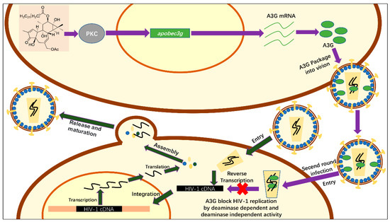 Schematic of the anti-HIV-1 activity mechanism of hop-8. The process shown with deep green arrows represents a simple schematic of HIV replication. Hop-8 stimulates A3G expression via the PKC pathway. A3G is packaged into the progeny virions and restricts the replication of the progeny virions (shown with purple arrows).