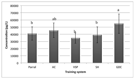 The lactones group, represented by only one compound, γ-butyrolactone, showed concentrations between 91 μg/L and 253 μg/L. The highest value was reached in the GDC training system (p < 0.05). γ-butyrolactone is a volatile compound found in wine and produced during fermentation and is responsible for a cheesy aroma [29]. This compound reached higher concentrations (>3.7 mg/L) in Loureira and Albariño wines from Galicia [33].