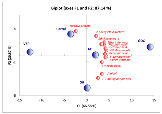 The first two principal components accounted for 87.14% of the total variance, 66.58% and 20.57%, respectively. PCA exhibited good discrimination amongst Albariño wines. The PCA shows the distribution of wines according to training system, where most families of volatile compounds contributed to wines from GDC training system. Therefore, grapes produced with the GDC training system will result in fruitier wines. Linalool and 2+3-methylbutyric acids characterized the SH training system and isoamyl acetate, the Parral system. Nevertheless, VSP was distinguished from the rest training systems, and it was not related to any group of compounds.