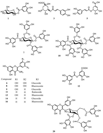 The phytochemical profile of an ethyl acetate (EtOAc) extract of P. persica was analyzed by HPLC coupled with photo diode array (PDA), evaporative light scattering detector (ELSD), and electro spray ionization mass spectrometry (ESIMS) detectors. A chromatogram recorded at 280 and 320 nm, together with the ELSD trace and the ESIMS base peak chromatogram, is shown in Figure 1. It revealed a complex pattern of peaks that were both UV active and ionizable in ESIMS in the negative mode. A total of 25 compounds were detected (Table 1). Of these, 14 compounds were purified and fully characterized, while the remaining 11 compounds were tentatively identified with the aid of their molecular formula calculated from liquid chromatography time of flight mass spectrometry (LC-TOFMS) data, and by a comparison with the literature [35,36,37,38,39]. Major compounds included myricetin, kaempferol, and quercetin glycosides, as well as galloyl glucoses bearing up to fourteen galloyl residues. Caffeic acid derivatives were found as minor compounds. The UV-visible spectra (typical maxima at approx. 280 nm) and m/z values were characteristic for the presence of hydrolysable tannins [40]. The ELSD trace chromatogram of the extract corresponded with the LC-UV-ESI-TOF-MS profile, and the comparison demonstrated that tannins specifically showed that octagalloyl glucose (peak 18), and flavonoids myricetin, quercetin, and kaempferol glycosides (peak 8, 13, and 14), were the major compounds in the EtOAc extract. The chemical structures of unambiguously characterized compounds are shown in Figure 2, and tentatively identified compounds are given in Table 1 [41].