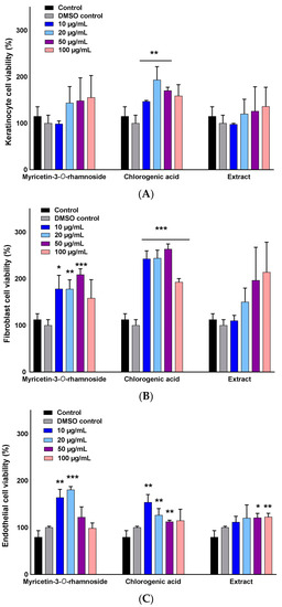 We investigated the viability of a normal human keratinocyte (NHEK), normal human dermal fibroblast (NHDF), and human umbilical vein endothelial (HUVEC) in the presence of two selected pure compounds, myricetin-3-O-β-rhamnoside and chlorogenic acid, to determine the optimum concentrations for subsequent wound healing assays. The results were compared to control groups containing growth media, growth media plus dimethyl sulfoxide (DMSO), and growth media containing varied concentrations of P. persica extract (Figure 3). The viability of NHEKs was slightly concentration dependent with myricetin-3-O-β-rhamnoside, but no cell toxicity was seen for both compounds in the concentration range of 10–100 µg/mL (Figure 3A).