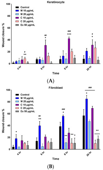 Wound closure percentage of (A) NHEKs and (B) NHDFs after different time intervals of exposure to different concentrations of the natural compounds, as measured using a scratch assay. Chlorogenic acid (C) and myricetin-3-O-β-rhamnoside (M) at 10 µg/mL demonstrated the highest effect on the migration of NHEKs and NHDFs in closing the gap. Multiple t-tests were performed using Graph-Pad Prism 7.03 to determine the significance between each experimental group and control (* p ≤ 0.05, ** p ≤ 0.01 and *** p ≤ 0.001). T-tests were performed to compare each pure compound group to extract (# p ≤ 0.05, ## p ≤ 0.01 and ### p ≤ 0.001).
