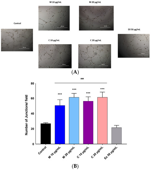 In vitro capillary tube formation of HUVECs treated in the absence or presence of myricetin-3-O-β-rhamnoside (M), chlorogenic acid (C), or the total extract (EX) of P. persica. (A) Phase contrast microscopy of the vascular network; (B) The number of junctions after 8 h of treatment. Tubular network formation was significantly higher for both the myricetin-3-O-β-rhamnoside (M) and chlorogenic acid compounds compared to the control (non-treated cells in growth media) and extract. Multiple t-tests were performed using Graph-Pad Prism 7.03 to determine the significance between each experimental group and control (*** p ≤ 0.001). T-tests were performed to compare each pure compound group to extract (### p ≤ 0.001).
