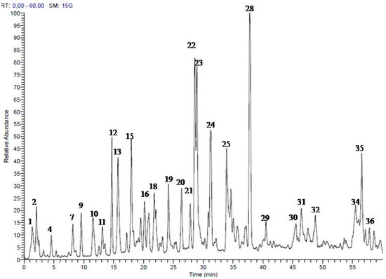 A Thermo Finnigan (Thermo Electron Corporation, Waltham, MA, USA) LC system coupled with an LCQ-Duo ion trap mass spectrometer with an ESI source (ThermoQuest Corporation, Austin, TX, USA) was used to profile the chemical constituents of the methanol extract. A rapid resolution-reversed phase column C18 (Zorbax Eclipse XDB-C18, 4.6 mm × 150 mm, 3.5 µm, Agilent, Santa Clara, CA, USA) was used to separate the compounds. The mobile phase consisted of the two solvents water and acetonitrile (ACN) (Sigma-Aldrich GmbH, Darmstadt, Germany), both in 0.1% formic acid (Sigma-Aldrich GmbH, Darmstadt, Germany). A 60 min gradient from 5% to 30% ACN was used with 1 mL/min flow rate. A Surveyor autosampler (ThermoQuest) and XcaliburTM 2.0.7 software (Thermo Fischer Scientific, Waltham, MA, USA) were used to inject the sample and to control the system. The MS conditions were used as previously described [26]. Full scan mode and mass range of 50–2000 m/z were adopted to record the ions.