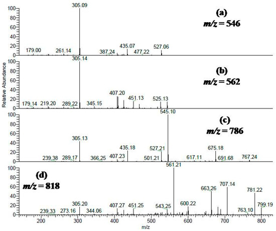 Two peaks (22 and 23) showed [M − H]− at m/z 545 and a main fragment ion at 305 (M − H −240); they were identified as (ent)cassiaflavan-(epi)gallocatechin as previously described [28]. A representative mass spectrum is shown in Figure 2a (m/z 546). Furthermore, four peaks (13, 15, 16, and 18) gave a molecular ion peak at m/z 561 and a main fragment ion at305 (M − H −256); they were tentatively assigned to (epi)guibourtinidol-(epi)gallocatechin, a spectrum is shown in Figure 2b (m/z 562). Additionally, compound 28 showed a [M − H]− at m/z 529 and a main fragment ion at 289 (M − H −240), it was assigned to (ent)cassiaflavan-(epi)catechin [28]. Another compound 36 was tentatively identified as (ent)cassiaflavan-(ent)cassiaflavan-(epi)catechin based on its [M − H]− m/z 769 and fragment ions 529 (M − H −240, loss of (ent)cassiaflavan moiety), and 289 (M − H −240 −240, loss of two (ent)cassiaflavan moieties).
