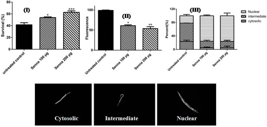 In C. elegans, plant extracts or compounds which are able to activate the FOXO transcription factor (DAF-16) increase the life span [34]. When activated, the transcription factor translocates from the cytosol into the nucleus to induce stress related genes [31]. The studied extract (100 and 200 µg/mL) was able to induce nuclear translocation in the transgenic strain TJ356 up to 76.19% compared with the untreated worms (21.56%). Representative pictures of the localization of DAF-16 (nuclear, intermediate and cytosolic) are illustrated in Figure 3III. Similar mechanisms have been reported for other plant polyphenolics and proanthocyanidin rich extracts [23,33,34,35].