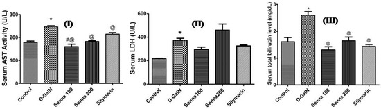 Effect of d-GalN (800 mg/kg, i.p.), bark extract (100 mg/kg and 200 mg/kg, oral), and silymarin on (I) AST (aspartate aminotransferase); (II) LDH (lactate dehydrogenase) activities (III) total bilirubin. Results are presented as mean ± SE. * significantly different compared to untreated control group. @ Significantly different compared to d-GalN treatment group at p < 0.05. # Significantly different from silymarin at p < 0.05. n = 6; using One Way ANOVA followed by Tukey’s post hoc test.