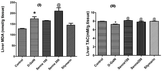 Effect of D-GalN (800 mg/kg, i.p.), bark extract (100 mg/kg and 200 mg/kg, oral), and silymarin on (I) MDA (malondialdehyde); (II) TAC (total anti-oxidant capacity) (nmol/g tissue) in the liver. Results are presented as mean ± SE. * Significantly different compared to untreated control group, @ Significantly different compared to d-GalN treatment group at p < 0.05. n = 6; using One Way ANOVA followed by Tukey’s post hoc test.