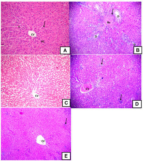The isolated liver tissues were fixed using 10% neutral formaldehyde. Then, the tissues were passed in ascending grades of ethyl alcohol (70%, 90%, and 100%) for dehydration. Then, they were cleared in xylol, soaked and then fixed in paraffin wax. 5-micron pieces were sectioned using a rotary microtome. The sections were stained with H&E stain to study the general microscopical structure of hepatic tissues and then examined under light microscope [52].