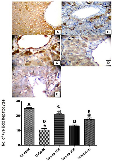 Bcl-2 is an essential anti-apoptotic protein that promotes survival and prevents apoptotic cell death [40]. The current study showed that increased oxidative stress associated with d-GalN administration decreased the number of hepatocytes with positive Bcl-2 expression. Reduction of Bcl-2 in liver cells by d-GalN increased apoptotic cell death. Similarly, the high dose level of the extract, which increased lipid peroxidation showed a weak stimulation of Bcl-2 similar to some extent as d-GalN. On the other hand, the low dose level of the extract (100 mg/kg) showed stronger positive enhancement of Bcl-2 than controls and silymarin (Figure 7). These results were similar to those previously reported [41,42]. To sum up, the low dose level of the extract (100 mg/kg) exerted a remarkable hepatoprotective activity against d-GalN induced hepatic injury and this might be attributed its antioxidant and antiapoptotic effects. Its effect was more potent than that of the high dose level (200 mg/kg) and silymarin.