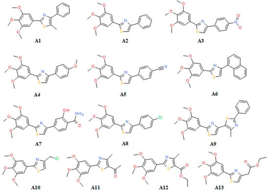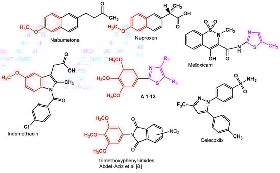 Thus, inspired by the classical NSAIDs, molecules which contain methoxy groups (nabumetone, indomethacin, naproxen) and also recent research undertaken by Abdel–Aziz et al. [8], as shown in Figure 1, we previously designed and synthesized a series of 4,5-substituted 2-(trimethoxyphenyl) thiazoles [9] (A1–13, Figure 2). The thiazole nucleus is a well established component of many drugs [10,11,12] and was chosen as a key moiety because it is present in known NSAIDs (meloxicam, fentiazac) and also in many lead anti-inflammatory molecules that are under development: 2-aryl-thiazole [13], furo[2,3-d]thiazole [14], coumarin-thiazoles [15], diarylthiazoles [16].