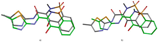 Overlay of meloxicam (MXM) conformation extracted from 4M11 (a) and 4O1Z (b) co-crystals (carbon shown in green) with the best docked conformer in cyclooxygenase (COX-2) and (COX-1) (carbon depicted in grey).