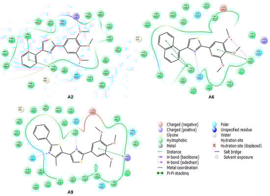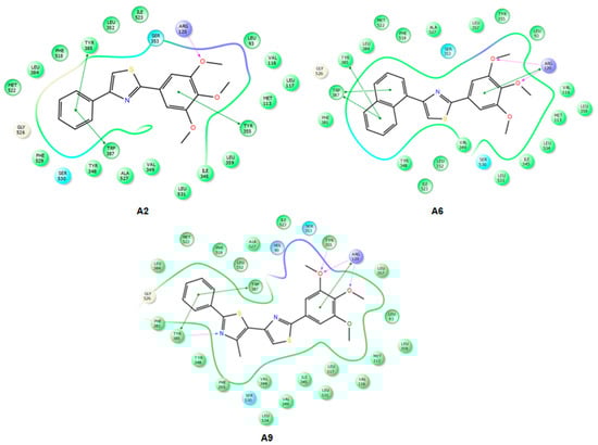 2D projection of the interactions of compounds A2, A6 and A9 with the active site of COX-2 (4M11).