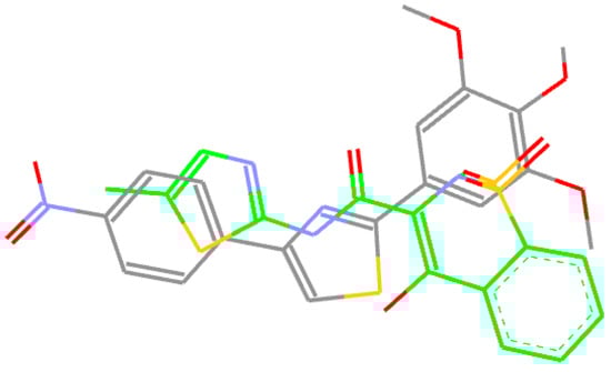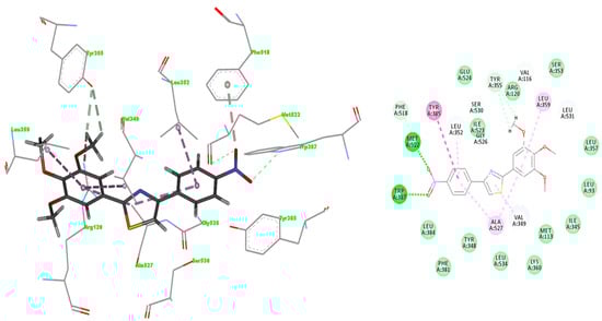 Whereas compound A3 interacts directly with Trp387 and Ser530, meloxicam interacts with Tyr385 and Ser530 by means of water 25. Tyr355 and Arg120 network with water 84 in 4M11 co-crystal, while compound A3 interacts directly with these residues by the means of oxygen atom of methoxy group. However, a direct comparison with meloxicam binding mode can be plausible since structurally dissimilar ligands can occupy the same binding site of COX-2 (Figure 5) [26]. Compound A3 (Figure 8) is inserted into a hydrophobic pocket rich in aromatic residues making hydrophobic interactions with Val349 (π-alkyl tri-methoxy-phenyl ring, π-σ thiazole ring), Leu352 (π-alkyl with nitro phenyl ring), Leu359 (trimethoxy-phenyl ring), Ala527 (π-σ thiazole ring), Phe518 (π-donor hydrogen bond nitro group), Gly526 (amide-π stacking nitro-phenyl ring), and Ala527 (π-alkyl tri-methoxy-phenyl ring). The 4-nitro-phenyl ring of A3 is situated in the area of the active site surrounded by aromatic residues including Phe518, Tyr385 and Trp387. Site-directed mutagenesis pointed out that the preference of meloxicam for COX-2 arises due to slight changes nearby Phe518 generated by the substitution of Ile434 with Val [29]. Meloxicam undergoes a direct interaction mediated by 4′-methyl group with Phe518, in contrast to protein shift observed in the case of the celecoxib analogue SC-558 [23,29]. In this context, compound A3 displays a binding pattern similar to that of moderately selective inhibitors of COX-2.
