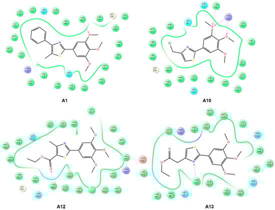 2D projections of the interactions of compounds A1, A10, A12 and A13 with the active site of COX-2 (4M11).