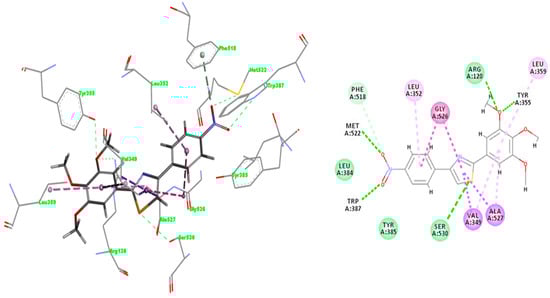 The interactions registered by compound A3 with COX-1 binding pocket (Figure 9 [28]) are similar to those registered in COX-2: two hydrogen bonds with Trp387 and Met522, whereas hydrophobic π-alkyl interactions appear with Leu352, Leu359, Val349, and Ala527 (two interactions). Carbon hydrogen bonds between the CH3 group belonging to the trimethoxy-phenyl ring occur with narrow groove residues Tyr355 and Arg120, and also one π-hydrogen bond with Phe518 was observed.