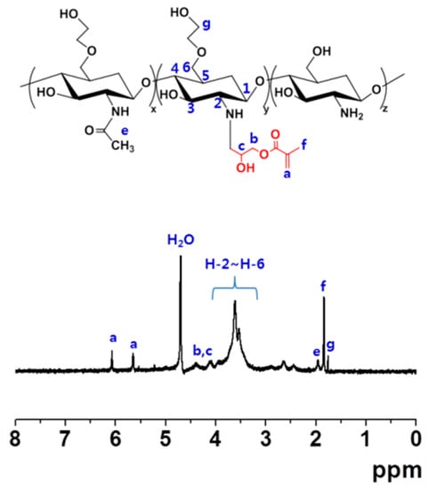 Conjugation of glycidyl methacrylate (GM) to GC was confirmed by 1H-NMR measurement (Figure 1). Several peaks at 1.83, 4.11, 4.39, 5.65 and 6.08 ppm were assigned for GM. Multiple peaks at 1.75, 1.95 and 3.24–3.96 ppm were observed for GC. The results demonstrated that GM was successfully conjugated to GC [8].