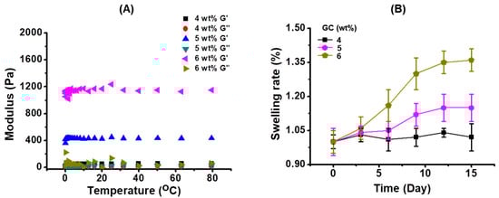 (A) Storage/loss (G′/G′′) moduli and (B) swelling ratio of GC hydrogels prepared by 4, 5, and 6 wt % of GC. The hydrogels showed larger storage modulus and loss. In addition, their swelling ratio increased with an increase of GC concentration.