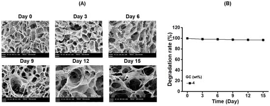(A) SEM images (×300) and (B) degradation rate of GC hydrogel (4 wt %) examined at 0, 3, 6, 9, 12 and 15 days. The hydrogels showed a porous, interconnected structure without mass loss as a function of time.