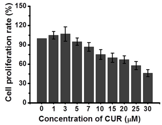 Figure 4 shows the cytotoxicity of CUR on L-929 cells as a function of CUR concentration. The cytotoxicity remained unchanged for up to 5 μM and decreased thereafter. This indicated that a CUR concentration below 5 μM is cytocompatible [15,16].
