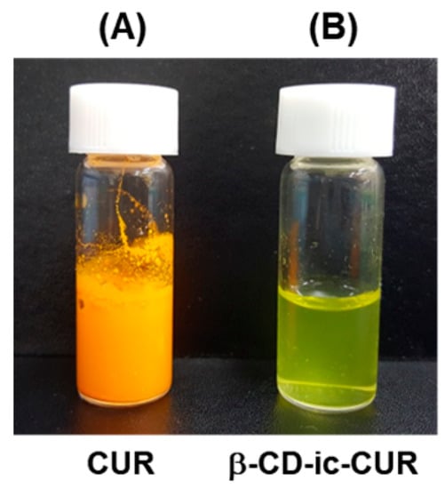 The inclusion complex was confirmed by simply mixing the aqueous solutions of β-CD and CUR (Figure 5). As shown in Figure 5A, CUR in water was not dissolved due to its poor water-solubility, but dispersed. On the other hand, CUR dissolved well in water, because β-CD could form an inclusion complex (Figure 5B) [17].