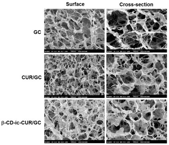 The surface and cross-sectional morphologies of freeze-dried GC, CUR/GC, and β-CD-ic-CUR/GC hydrogels were observed by SEM (Figure 6). A porous, interconnected structure was observed on the surface and in the cross-section. There was a marginal difference in the size of pores on the surface and in the cross-section. Furthermore, CUR and β-CD-ic-CUR were not observed in CUR/GC and β-CD-ic-CUR/GC, respectively. These observations could be attributed to the small sizes of CUR and β-CD-ic-CUR.