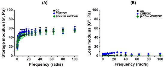The storage (G′) and loss (G′′) moduli of the samples were evaluated as a function of frequency from 0 rad/s to 100 rad/s, by rheometry (Figure 7). After visible-light irradiation, the storage moduli of the samples were greater than their loss moduli. This indicated that the samples were converted from sol state to gel state [8]. The storage and loss moduli of the samples were between 40 Pa and 60 Pa, and below 10 Pa, respectively, and no significant differences between the samples were observed. At 100 rad/s, the storage moduli of GC, CUR/GC, and β-CD-ic-CUR/GC were 59.2 Pa, 57.5 Pa, and 55.5 Pa, respectively.