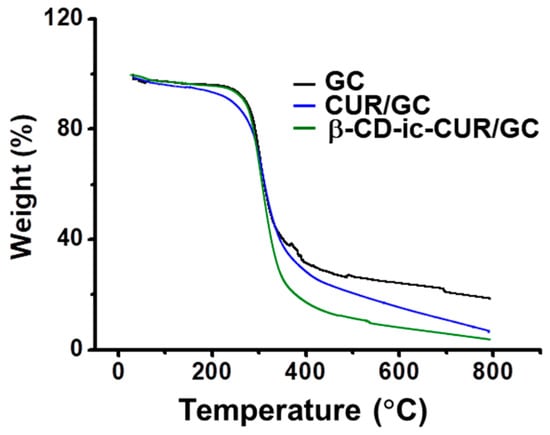 TGA curves of the lyophilized GC, CUR/GC, and β-CD-ic-CUR/GC hydrogels analyzed from 10 °C to 800 °C. The hydrogels exhibited no remarkable thermal behavior owing to the modest quantity of CUR or β-CD-ic-CUR.