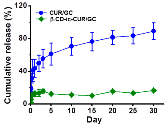 The cumulative percentages of CUR release from CUR/GC and β-CD-ic-CUR/GC were evaluated for a release period of 30 days in phosphate buffered saline (PBS, pH 7.4), as shown in Figure 10. β-CD-ic-CUR/GC exhibited controlled CUR release in a sustained manner, and the release became 90% after 30 days, after an initial burst within 12 h. However, the cumulative percentage of CUR release from CUR/GC was below 17% throughout the release period. This indicated that β-CD served as an excipient for controlling CUR release [21].