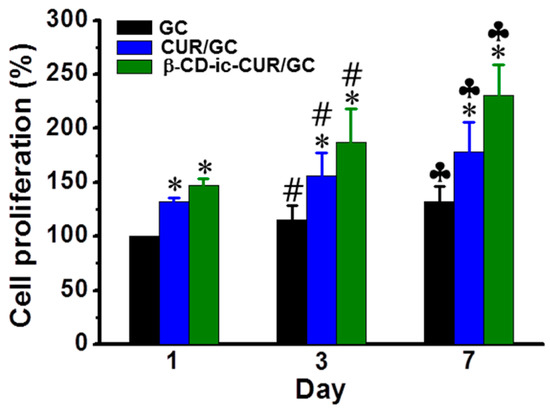 Proliferation of the L-929 cells cultured on the GC, CUR/GC, and β-CD-ic-CUR/GC hydrogels, evaluated by the CCK-8 assay. * p < 0.05, significance of CUR/GC and β-CD-ic-CUR/GC compared with GC; # p < 0.05, significance of day 3 compared with day 1; ♣ p < 0.05, significance of day 7 compared with day 1. The cells proliferated actively on the β-CD-ic-CUR/GC hydrogel throughout the culture periods, compared with GC and CUR/GC. GC, glycol chitosan hydrogel; CUR/GC, curcumin-loaded glycol chitosan hydrogel; β-CD-ic-CUR/GC, curcumin-conjugated β-CD-loaded glycol chitosan hydrogel.