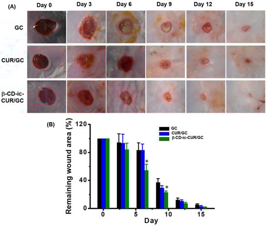 (A) Photographs and (B) remaining area (%) of the wounds after 0, 3, 6, 9, 12, and 15 days of hydrogel treatment. * p < 0.05. The most rapid wound healing was observed in the β-CD-ic-CUR/GC-treated wound throughout the healing periods. GC, glycol chitosan hydrogel; CUR/GC, curcumin-loaded glycol chitosan hydrogel; β-CD-ic-CUR/GC, curcumin-conjugated β-CD-loaded glycol chitosan hydrogel.