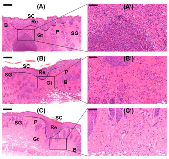 The histological analyses of the wounds treated with the GC-based hydrogels for 15 days, by H&E and Masson’s trichrome (MT) staining were conducted, and compared with the control (Figure 13 and Figure 14). The wound samples commonly exhibited scabs (SC), re-epithelialization (Re), granulation tissues (Gt), sebaceous glands (SG), papillae (P), and bulbs (B). The magnified H&E-stained images showed that the GC-based hydrogel-treated samples exhibited a lower number of inflammatory cells than the control-treated samples [8]. Remarkable collagen synthesis was observed in the GC-based hydrogel-treated samples. Treatment with β-CD-ic-CUR/GC, in particular, increased the extent of collagen synthesis. The results indicated that improved CUR water solubility accelerated the healing of the soft-tissue defects.