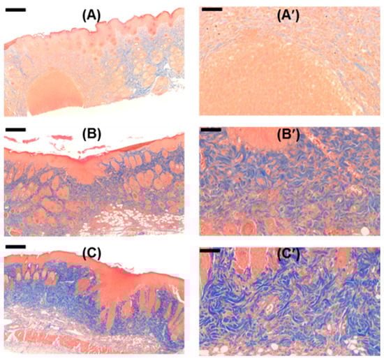 Masson’s trichrome-stained images of the wounds after 15 days of hydrogel treatment; (A,A′) GC-treated wound, (B,B′) CUR/GC-treated wound, and (C,C′) β-CD-ic-CUR/GC-treated wound. Black scale bar is 200 μm. The highest extent of collagen synthesis was observed in the β-CD-ic-CUR/GC-treated wound. GC, glycol chitosan hydrogel; CUR/GC, curcumin-loaded glycol chitosan hydrogel; β-CD-ic-CUR/GC, curcumin-conjugated β-CD-loaded glycol chitosan hydrogel.