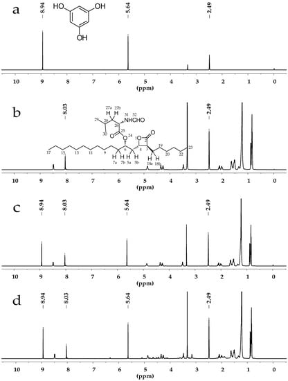 (a) 1H-NMR spectrum of phloroglucinolanhydrous in dimethylsulfoxide-d6 (DMSO-d6); (b) 1H-NMR spectrum of Orlistat in DMSO-d6; (c) 1H-NMR spectrum of Orlistat and phloroglucinolanhydrous in DMSO-d6; (d) 1H-NMR spectrum of Orlistat tablet powder extractive and phloroglucinolanhydrous in DMSO-d6.