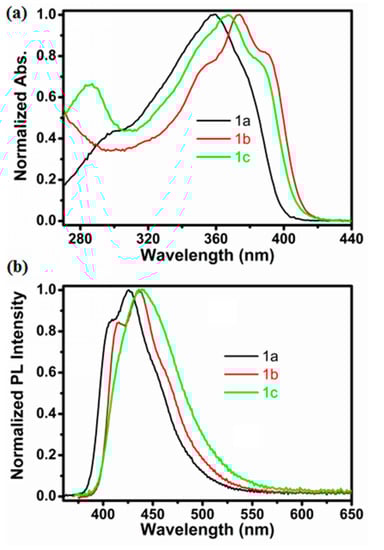 Scheme 1 depicts the synthetic procedure for the preparation of compounds 1a–1c according to previous studies [42,43]. The two adjacent phenyl rings of compound 1a were connected through C–C bond to form compound 1b, which exhibited a rigid structure and high degree of coplanarity, to investigate the relationship between molecular structures and optical behaviors. Furthermore, two sp2-hybridized N atoms as electron-withdrawing substituents were introduced into compound 1b to form compound 1c to study the electronic effects of substituents. Consequently, compound 1a displayed a symmetrical structure, whereas compounds 1b and 1c had an asymmetrical structure.
