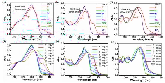 UV/Vis absorption spectra of DMSO solutions of (a) compound 1a; (b) compound 1b; and (c) compound 1c (10−5 mol L−1) in the absence (blank) and presence of nine anions (20 equiv.). UV/Vis absorption spectra of DMSO solutions of (d) compound 1a; (e) compound 1b; and (f) compound 1c (10−5 mol L−1) with different amounts of Bu4N+F−.
