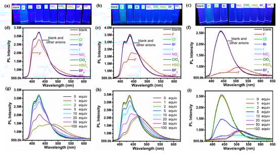 Photographs of the DMSO solutions of (a) compound 1a; (b) compound 1b; and (c) compound 1c (10−5 mol L−1) in the absence (blank) and presence of nine anions (20 equiv.) taken under UV light at 365 nm. Emission spectra of DMSO solutions of (d) compound 1a; (e) compound 1b, and (f) compound 1c (10−5 mol L−1) in the absence (blank) and presence of nine anions (20 equiv.). UV/Vis absorption spectra of DMSO solutions of (g) compound 1a; (h) compound 1b; and (i) compound 1c (10−5 mol L−1) with different amounts of Bu4N+F−.