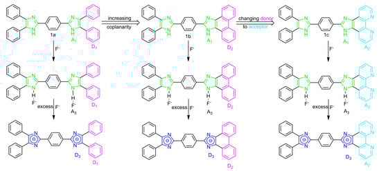 In this study, we synthesized one symmetrical structure called 1,4-bis(4,5-diphenyl-1H-imidazol-2-yl)benzene (1a) and two asymmetrical structures, namely 2-(4-(4,5-diphenyl-1H-imidazol-2-yl)phenyl)-1H-phenanthro(9,10-d)imidazole (1b) and 2-(4-(4,5-diphenyl-1H-imidazol-2-yl)phenyl)-1H-imidazo(4,5-f)(1,10)phenanthroline (1c), which have been further used as optical sensors for fluoride ion. The relationship between molecular structures and optical properties for the analysis of fluoride ion has been investigated in terms of five aspects: (1) Compared with mono-imidazole derivatives, the fluorescence quantum yields of bisimidazole are higher; (2) In view of the influence of molecular rigidity on optical performance for the analysis of fluoride ion, two adjacent phenyl rings are connected through C–C bond to increase molecular coplanarity; (3) The introduction of two sp2-hybridized N atoms as electron-withdrawing substituents into the molecular backbone is intended for the investigation of the electronic effects of substituents; (4) As shown in Scheme S2 (Supplementary Materials), compared with compound 1a, compound 1b exhibits better coplanarity which is more favorable for carrier transport and then improves the detection limit of sensors. Phenanthrene group was used as an electron donor in compound 1b and then charge transfer can easily occur from phenanthrene group (donor) to imidazole group (acceptor). However, when phenanthrene group is changed to 1,10-phenanthroline group, charge transfer cannot easily occur from 1,10-phenanthroline group to imidazole group because 1,10-phenanthroline group is an stronger electron accepor, compared with imidazole group; (5) When compounds 1a–1c dimethyl sulfoxide (DMSO) solution are added with excess fluoride ion, deprotonation of imidazole group occur which changes imidazole group as an electron donor to as an electron acceptor [33,41], leading to different charge transfer process of compounds 1b and 1c. Thus, the optical properties of compounds 1a–1c DMSO solution for the analysis of fluoride ion influenced by the molecular structures and electronic properties of substitute groups are investigated in detail.