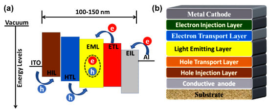 Organic light emitting diodes (OLEDs), which are organic luminescent materials made of small molecules and polymers, have been widely used in next-generation high quality flat-panel displays and solid-lighting applications [1]. The operating principle of OLEDs is associated with electron-transporting (ETL) and hole-transporting layers (HTL), the interface of which functions as a site for the recombination and light emission processes depicted in Figure 1a together with typical device configuration in Figure 1b. High fluorescence quantum yields of luminous materials in the solid state, HOMO–LUMO energy levels, good electron and hole transport behaviours, film-forming properties, good thermal and oxidative stabilities, and outstanding colour purities are inevitable parameters for the construction of promising OLED devices [2]. In general, the external quantum efficiency (EQE) is the most direct parameter to define the device efficiency of OLEDs. Although, conventional OLEDs containing triarylborane-based materials as emitting layers have demonstrated low EQEs, their incorporation into OLEDs provided potential applications as efficient electron transporters [3,4] and electroluminescent (EL) layers [5,6,7]. Recently, EQEs, recorded for several devices containing new triarylboranes, have achieved the highest values up to 22.8% for green emission through the newly explored thermally-activated delayed fluorescence (TADF) process [8,9,10,11,12].