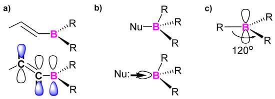 Triarylborane-based conjugated luminescent compounds have potential applications as important building blocks in material chemistry due to their excellent photophysical and electrochemical properties. They possess a trigonal planar sp2-hybridized trivalent boron atom with a vacant p orbital in the electronic ground state [13]. Thus, as triarylborane has an inherently electron deficient property, it is used as an electron acceptor and a Lewis acid in donor (D)–acceptor (A) organic π-conjugated systems. The steric hindrance around the boron centre, generated by the bulky groups, was proved several decades ago to be a useful way to prepare air-stable triarylboranes [13]. These compounds with broad π-conjugate systems render pπ-π* conjugation effectively (Figure 2), which can be verified by their characteristic absorption and high emission properties [13]. Numerous interesting and highly functional triarylborane-based organic materials have been developed, including those with boron units as pendants [14,15,16,17,18] and in the main chain [19] of extended and conjugated materials. As a result of their photophysical properties, triarylborane-containing materials have been synthesized as promising units in diverse applications such as luminescent [20,21], electron-transporting [22,23], nonlinear optical and two-photon absorption materials [24,25] and anion sensors [26,27].