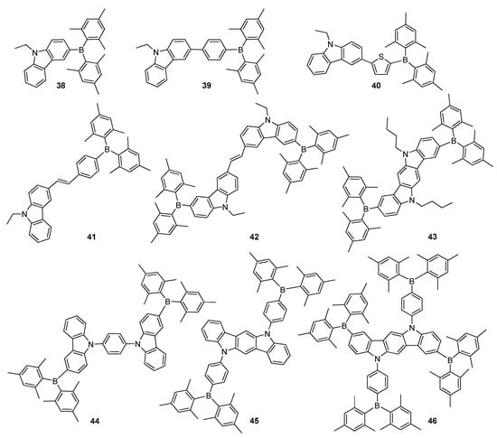 Moreover, triarylborane-based compounds have been widely utilized as blue emitting materials, which are essential ingredient for full colour displays due to their high brilliance and obvious colour purities [42]. Although blue OLEDs required the use of a dopant system to improve OLED efficiency, control of the dopant concentration using co-evaporation methods was not an easy task. Thus, this fabrication problem was overcome by the development of high performance blue light-emitting materials, which are suitable for non-doped blue OLEDs. Ambipolar blue light emitting materials with the components of electron-donors (carbazole, etc.) and electron-acceptor such as triarylborane ease exciton formation via stable cation and anion radicals, and improve charge balancing together with EL efficiency in OLEDs [5,6,69]. Carbazoles are known to produce short wavelength absorption and emission spectra due to their weak electron donor character with respect to other amino-donors [70]. Therefore, Jeng and co-workers synthesized ambipolar fluorophores 38–41 containing carbazole as electron donor, different π-spacer groups and Mes2B for potential applications in highly efficient non-doped blue OLEDs (Figure 8) [71]. Compounds 38–41 displayed deep-blue to greenish-blue PL spectra with emission peaks at 403, 443, 470 and 503 nm, respectively, among which 39 and 40 had lower LUMO energy levels and blue photoluminescent solid state quantum yields as high as 54% and 51%, respectively. While the OLED based on 39 was a deep-blue with the CIE coordinates of (0.15, 0.09), EQE of 4.3% and maximum brightness of 5350 cd·m−2, the device fabricated using 40 demonstrated blue EL with the CIE coordinates of (0.13, 0.21), higher EQE of 6.9% and maximum brightness of 28,300 cd·m−2. This state can be rationalized by their relatively high solid state ΦF of 39 and 40, which are also crucial to achieve high EQEs. Moreover, the ideal arrangement of HOMO–LUMO energy levels in devices also contributes significantly.