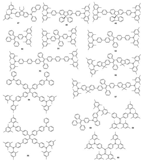 Choi’s group reported luminescent material 58 bearing a TPE unit connected to a carbazole core as a hole transporting unit and Mes2B as electron transporting group to develop the blue light-emitting material (Figure 9) [82]. Compound 58 was indicated to be a promising emitting material for non-doped EL devices, owing to its excellent thermal, electrochemical and charge-transporting properties. Its OLED device furnished pure blue emission appearing at 464 nm with CIE coordinates of (0.18, 0.21), Lmax of 4624 cd·m−2 and ηC,max of 4.28 cd·A−1. Thilagar’s groups reported new polyaromatic aminoboranes 59 and 60 containing substituted one or two Mes2B units (Figure 9) [83]. These compounds exhibited pure blue emissions with AIE enhancement (AIEE) features in solid state, rendering to be used as promising materials for potential applications in blue OLEDs.