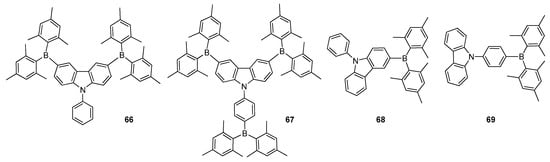 Organic EL materials are regularly categorized into fluorescent and phosphorescent materials depending on their luminescence mechanisms. Phosphorescent materials have become popular as OLED materials alternative to fluorescent compounds due to their excellent light-emitting performances [92]. Recently, ambipolar molecules containing electron donors such as carbazole, arylamine and electron acceptors such as triarylboranes have appeared as attractive materials for organic EL phosphorescent devices as a result of their excellent luminescent, hole-transporting and electron transporting properties. Lin et al. reported a new ambipolar host material 66 having two Mes2B and carbazole core units for phosphorescent OLED applications (Figure 11) [93]. This compound exhibited high EQEs of 20.7% for red, 20.0% for green, 16.5% for blue, and 15.7% for white emissions. Later, Shi and co-workers connected a Mes2B group symmetrically to a phenylcarbazole at the para position in molecule 66 to obtain new star-shaped host material 67, which demonstrated excellent thermal and electrochemical stabilities, high ΦF of 0.95 (in THF) and high triplet energy (2.83 eV) (Figure 11) [94]. Various colours of phosphorescent OLED devices constructed using 67 exhibited a maximum brightness of ηC,max of 12,337 cd·m−2 and 11.04 cd·A−1 for red, 26,473 cd·m−2 and 38.60 cd·A−1 for green and 7622 cd·m−2 and 7.39 cd·A−1 for blue at different voltages. As a result, it demonstrated great potential in generating phosphorescent OLED devices for display and lighting applications.