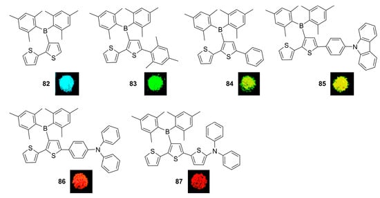Yamaguchi and co-workers investigated a series of 3-boryl-2,2′-bithiophene-based π-conjugated materials 82–87, containing different electron donating groups as new highly emissive systems (Figure 14) [16]. These materials achieved not only intense solid-state emissions, but also full colour emissions covering a wide range from blue (477 nm for 82) to deep red (660 nm for 87). In addition, all the compounds exhibited large Stokes shifts and efficient solid state emissions by ICT transitions from thiophene moiety to the boron pendant.
