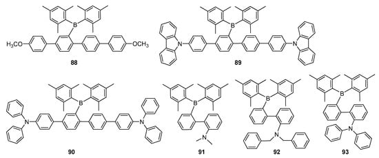 To achieve an intense solid-state emission, Zhao and co-workers designed a new family of p-quaterphenyls 88–90, laterally substituted with bulky electron-deficient Mes2B groups (Figure 15) [105]. The p-quaterpheyl backbone displayed very limited conjugation, which was expected to hinder the red shift, so thus, they provided in blue light area with emission maxima wavelengths ranging from 446 to 473 nm. In addition, all the lateral boryl substituted p-quaterphenyl derivatives indicated an intense fluorescence in spin-coated films with excellent ΦF of 0.99 for 88, 0.83 for 89 and 0.99 for 90 due to their absence of the intermolecular interaction in solid state as well as a large Stokes shift induced by the ICT transition. In particular, compounds 89 and 90, containing carbazole and TPA groups on a π-conjugated framework, could be employed as promising ambipolar transporting blue emitters in OLED applications, owing to their high thermal stabilities, good oxidation−reduction properties and excellent solid state fluorescence efficiencies.
