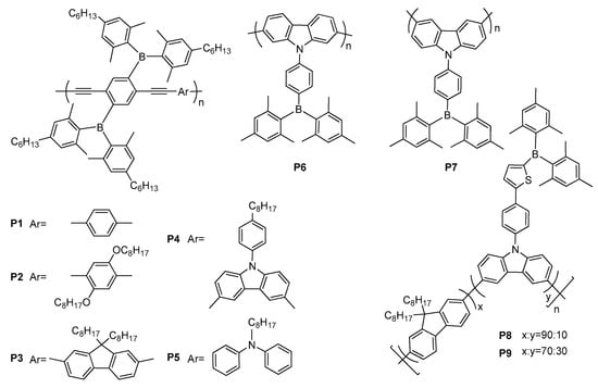 Triarylborane-substituted π-conjugated polymers P1–P9.